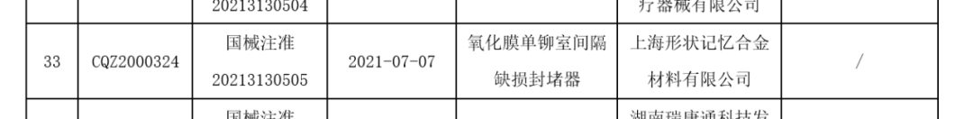2021年7月7日,上海形状记忆合金材料有限公司(以下简称“上海形状记忆”)自主研发的“氧化膜单铆室间隔缺损封堵器”(商品名:MemoCarna氧化膜单铆室间隔缺损封堵器)正式获得了国家药品监督管理局三类医疗器械注册证(国械注准20213130505)。至此,氧化膜单铆封堵器系列三款新品已全部获批临床应用。