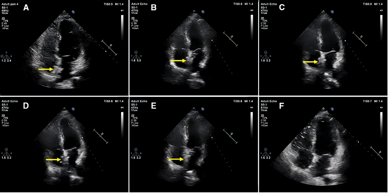 黄色箭头所示为生物可降解封堵器。出院前(A)、术后1个月(B)、3个月(C)、6个月(D)、12个月(E)及24个月(F)随访时均进行了经胸超声心动图四腔心切面检查。术后24个月时,封堵器已完全降解。
