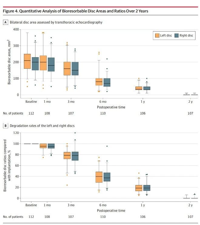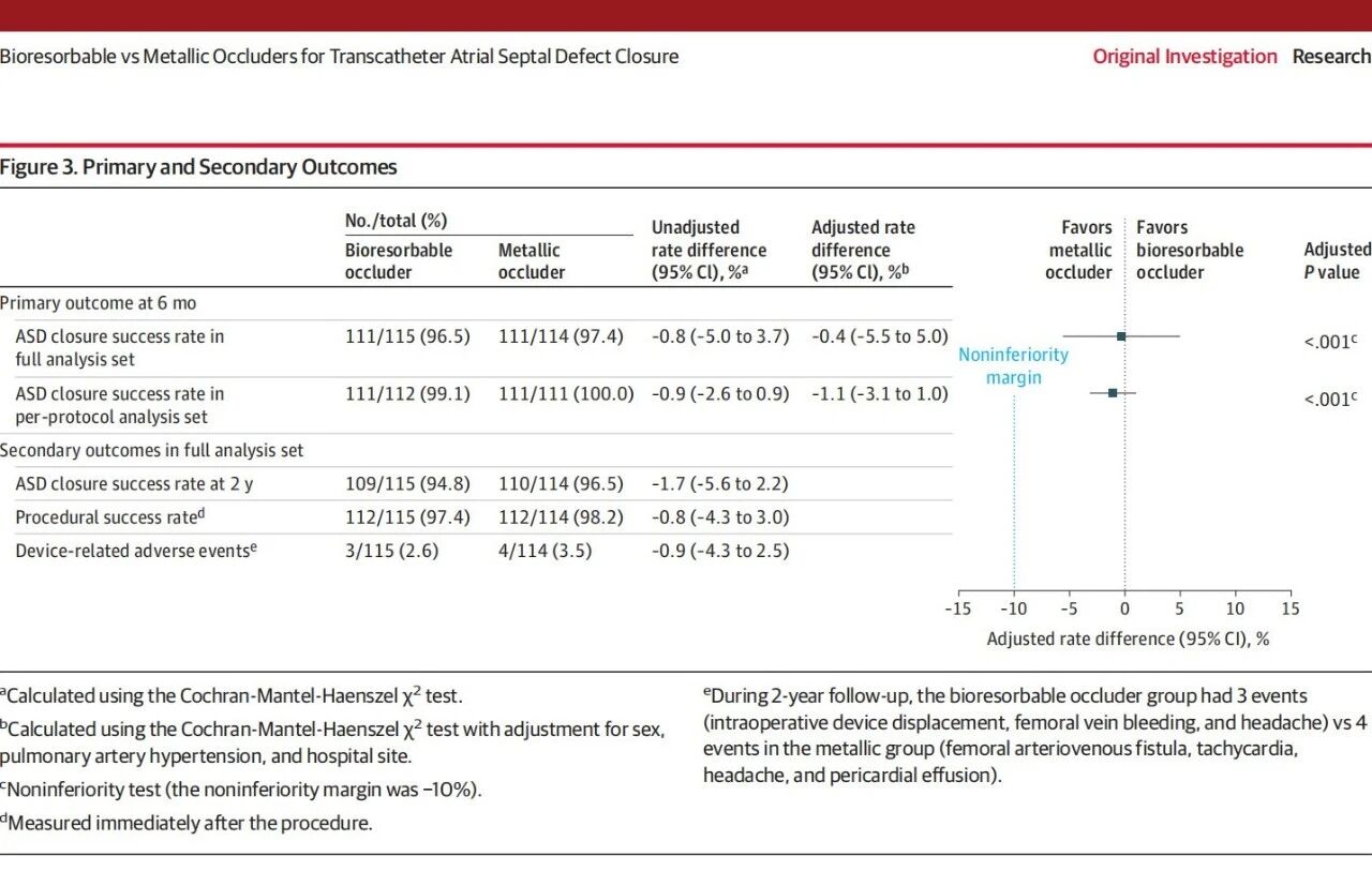 生物可降解封堵器在房间隔缺损封堵中不劣于金属封堵器,且在两年内实现近乎完全降解。这些发现表明,生物可降解封堵器可为经导管房间隔缺损封堵提供一种有价值的创新选择。